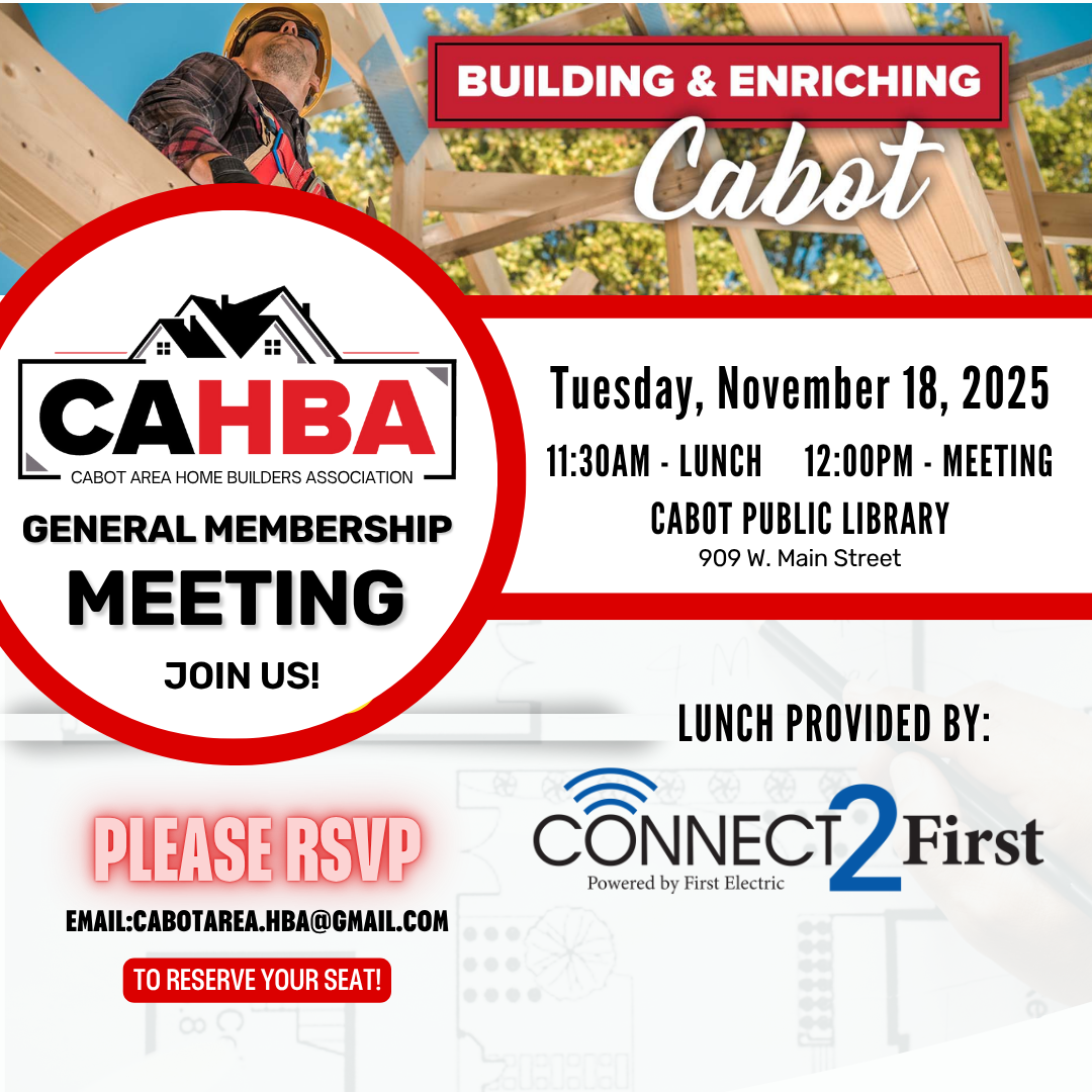 Join us to discuss Cabot Area Home Builders Association initiatives, upcoming events, and ways for members to get involved as we continue supporting the home building industry and encouraging the next generation of builders.